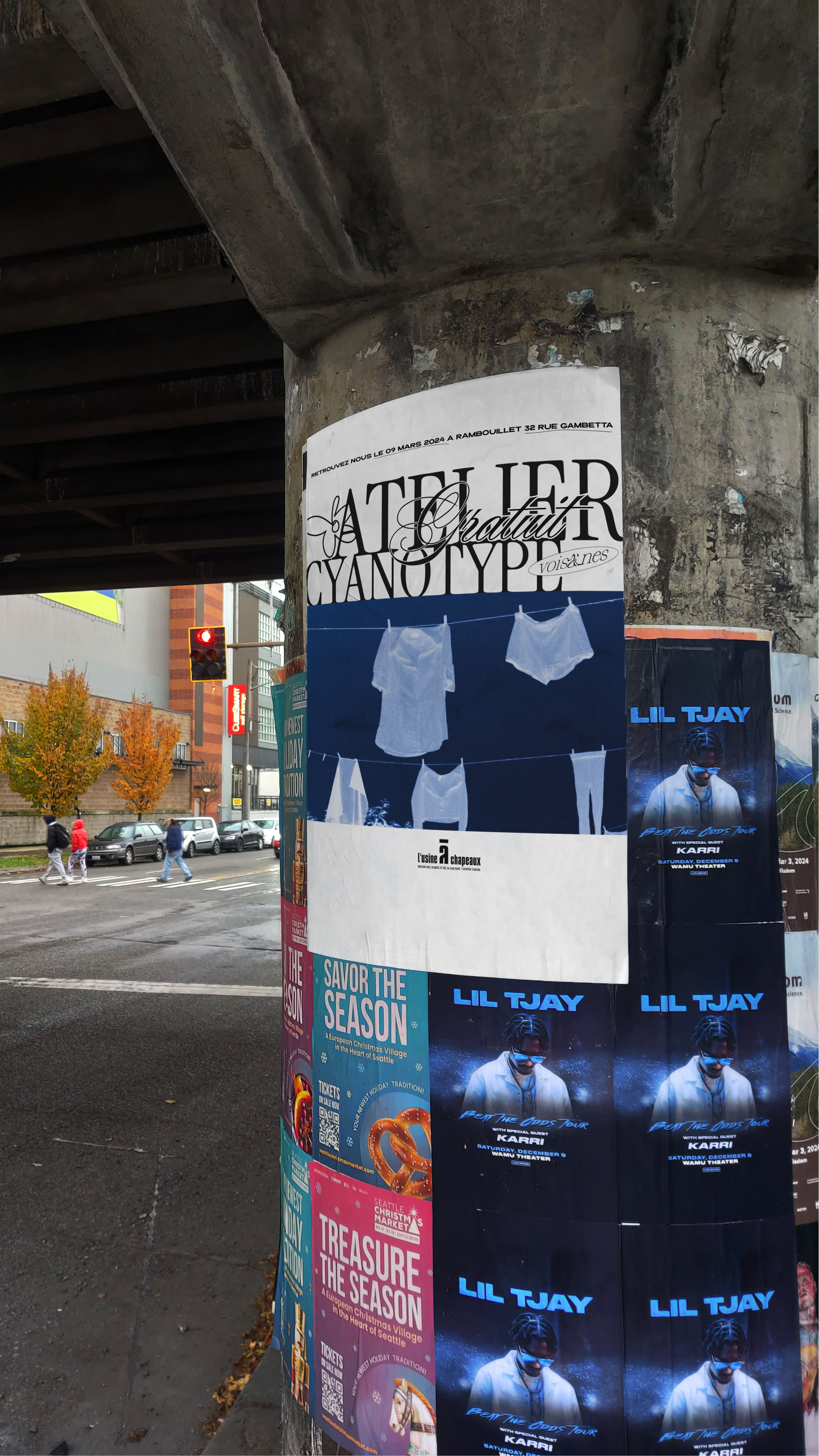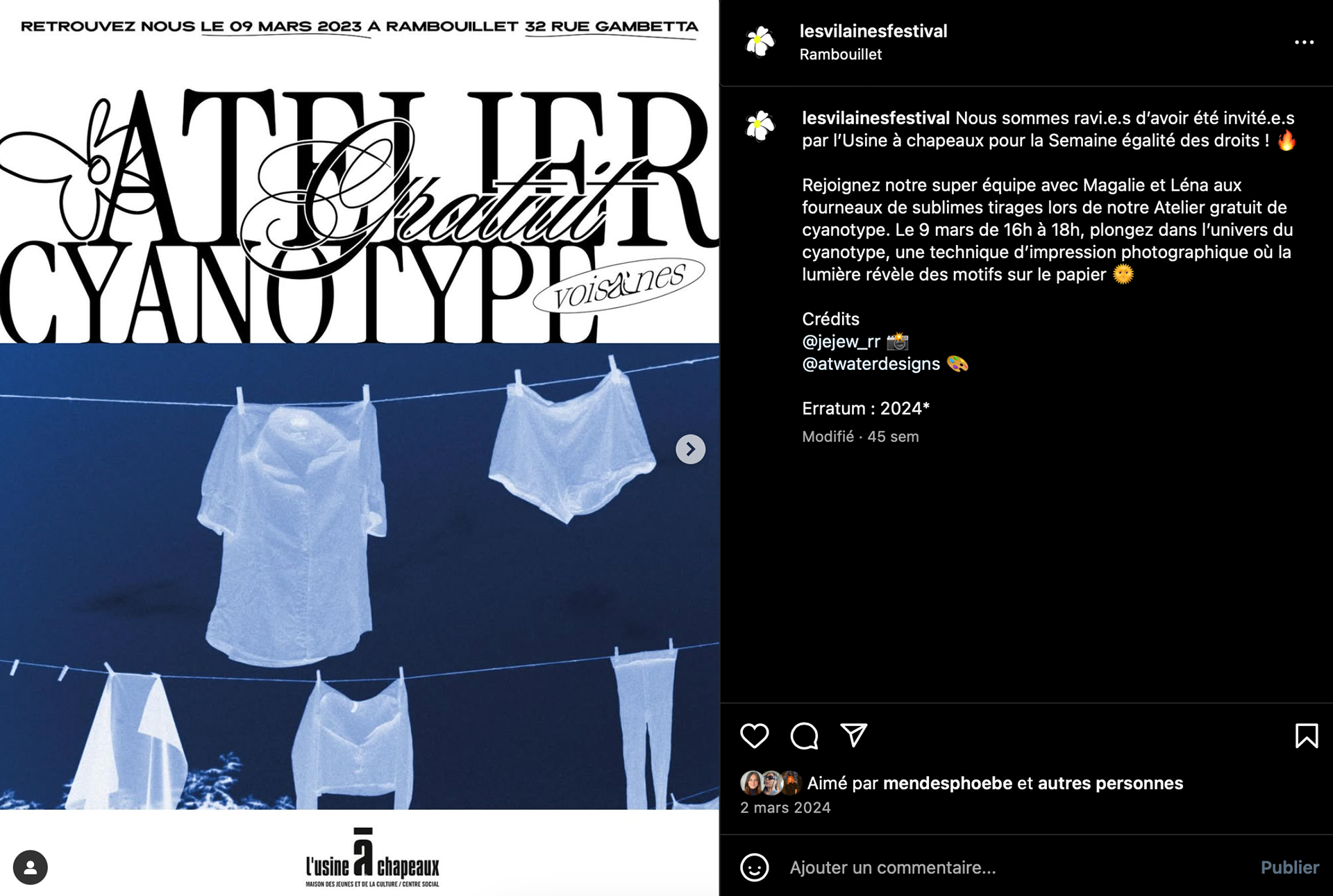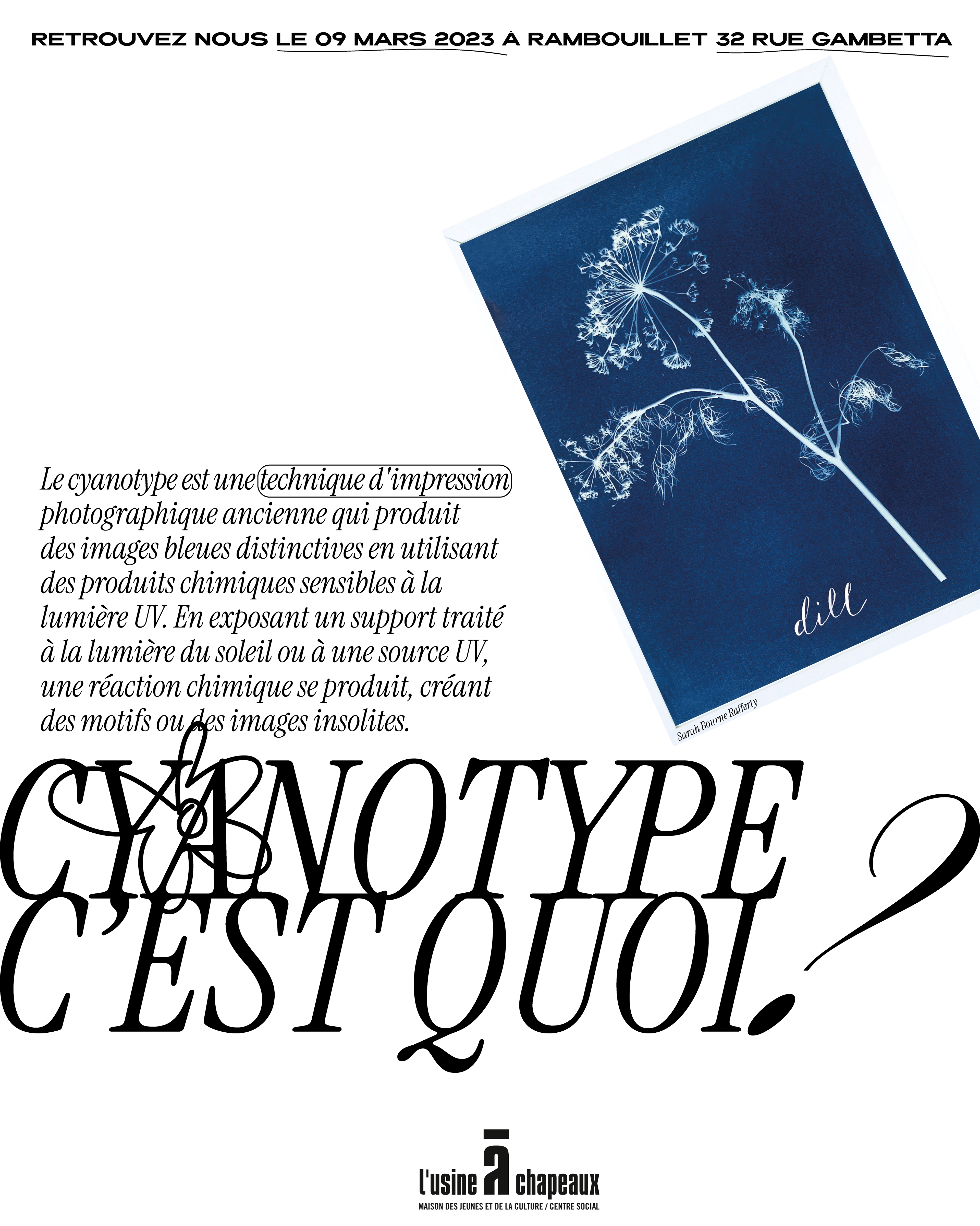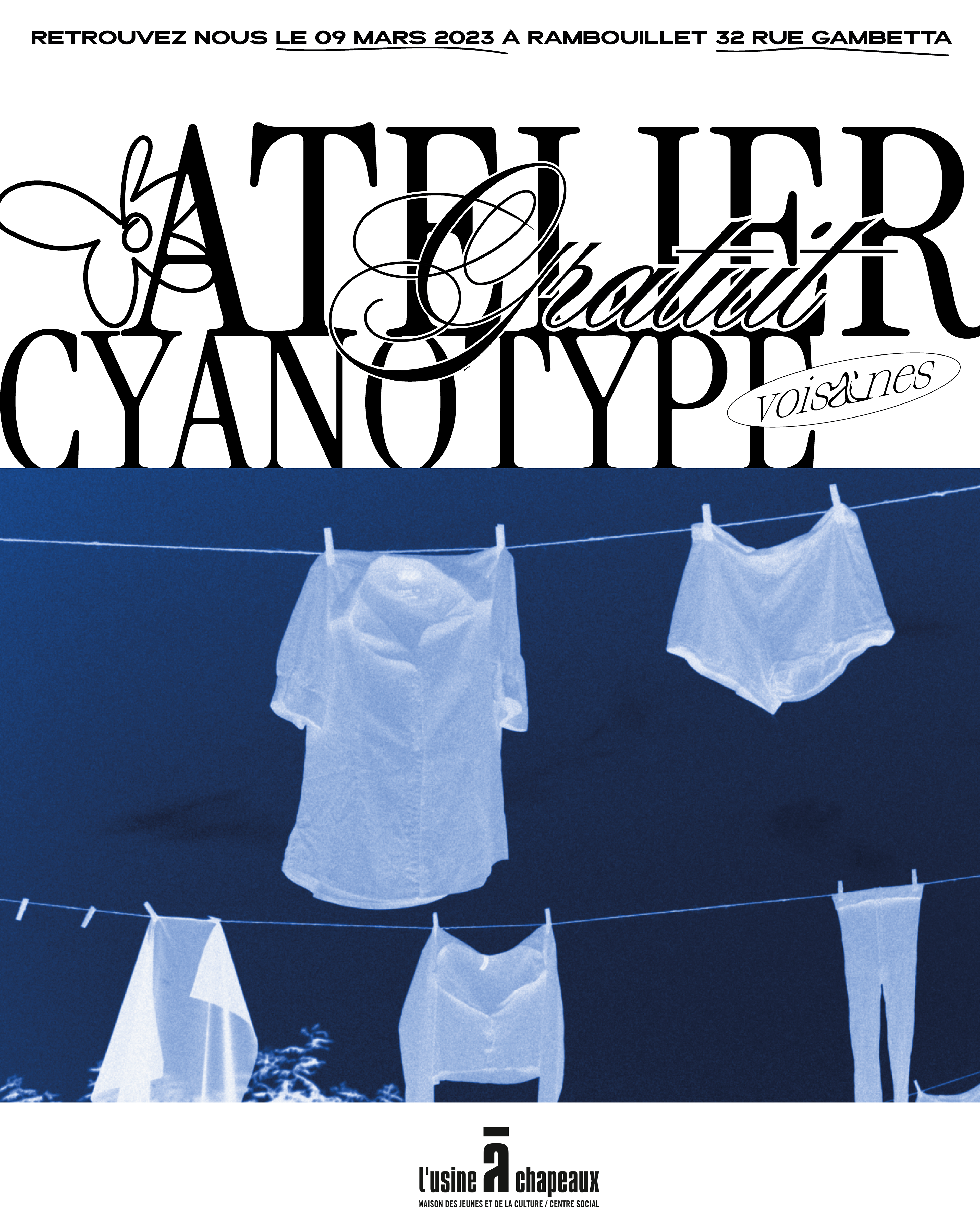 Conception et réalisation d'une affiche et de la communication autour de l'atelier cyanotype des Voisaines dans le cadre de la semaine de l'égalité des droits par l'Usine à Chapeaux (Maison des Jeunes et de la Culture de Rambouillet)